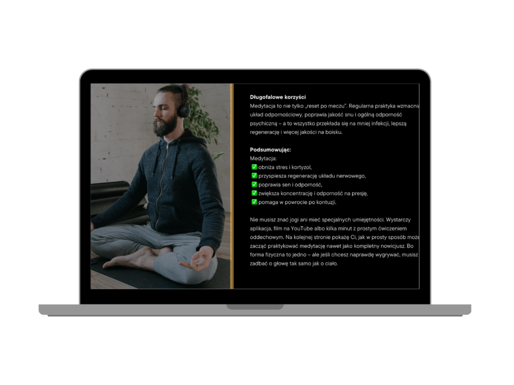 Zamiast próbować losowych metod z TikToka — dostajesz konkret, oparty na badaniach i doświadczeniu pracy z zawodnikami z Ekstraklasy i reprezentacji Polski. Wszystko podane prostym językiem.